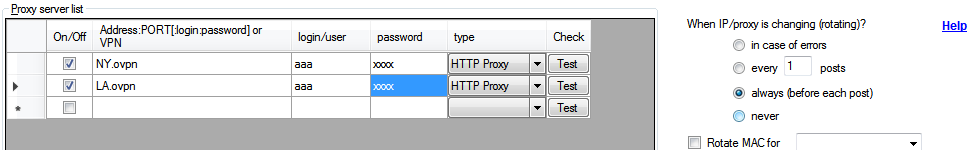You can add your proxy under settings tab: Input Proxy Address and its port number with semicolon separator in the last blank row (for example, 11.22.33.44:8080) "Address" is proxy server host name or IP. "Port" is proxy server port number (for example, 8080). "type": Choose proxy type ( it is HTTP proxy by default) Enter "Login"/"Password" if you have them A few things to Note: 1. We do not supply the IP addresses to use with the Proxy IP addon. You will need to find a proxy ip service to properly use this addon. Here is oxylabs.io or smartproxy.com or geonode.com 2. Login/Password isn't needed for some IPs. This will obviously depend on the IP's you are using. 3. "in case of errors" - proxy will be used if the program can't get the page. 4. "every 100 posts" - proxy will be rotated each 100 posts. 5. "always" proxy will be used for the first post too. 6. There is !proxy{23.123.32.12:8080} (or more advanced !proxy{23.123.32.12:8080:proxyusername:proxypassword}) keyword to define HTTP proxy server in your ad's body. It is !proxy{socks=23.123.32.12:8080} for socks proxy. 7. You can use the mac address rotator instead of proxy servers if your provider give you a new IP every time you change your Network card MAC-address. Software can change the MAC address automatically for selected Network card. It assigns random MAC address for specified network card. It is done to make your Internet provide to assign you new ip (i.e. change ip) after MAC change (but it doesn’t work for all providers). You shouldn’t use it if you get static MAC address from provider. 8. For a more information about the Proxy IP addon click here 9. You can select last row in the proxy table (Click on asterik symbol on grey field to select last row) in the program and press Ctrl+V to paste your proxy list from clipboard. 10. You can run external program (from batch file) for changing ip. Click here 11. There are private and public proxies. Private proxy is usually paid one, protected by password and its IP is used only by you. CL doesn’t know Its IP and it is not blocked. Public proxy is usually available for free in Internet and used by many people so Craigslist/Kijiji blacklists it to deny posting from it. Your proxy must also support HTTPS protocol as it is required for posting. 12. You can use OpenVPN connections instead of proxies. You need to get OpenVPN files (something like NY.ovpn) from your VPN provider first. Then install OpenVPN from here. Place your .ovpn files into the program's folder (usually C:\CLAPoster) and input NY.ovpn file names instead of proxies (you can also specify full path to the files). it should look something like this: